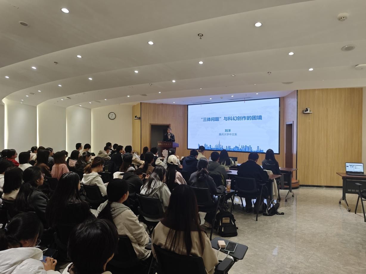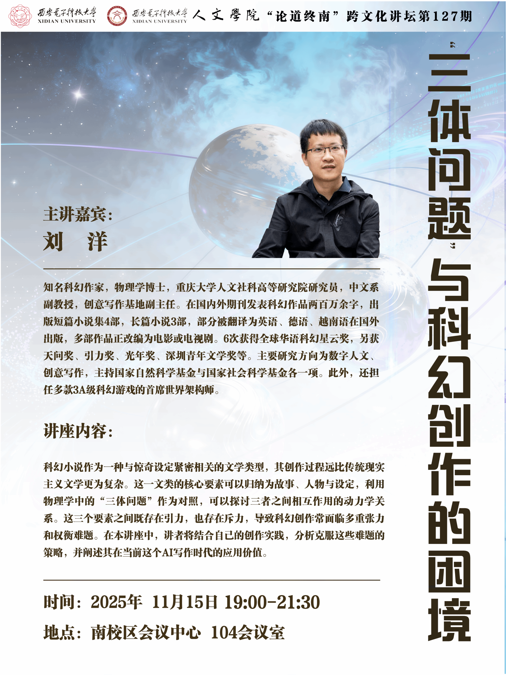 (通讯员 赵辉)11月15日19:00,beat365亚洲版官网“论道终南”跨文化讲坛第127期在南校区会议中心101会议室举办。本次讲座邀请重庆大学人文社科高等研究院研究员、中文系副教授、创意写作基地副主任、著名科幻作家刘洋主讲,主题为“‘三体问题’与科幻创作的困境”。讲座由中文系主任朱佳宁副教授主持,beat365亚洲版官网、校科幻协会以及其他高校科幻协会的师生共100余人参加。本次讲座从科幻小说的创作结构出发,结合物理学中的“三体问题”,深入探讨了科幻创作的内在逻辑与叙事张力。...