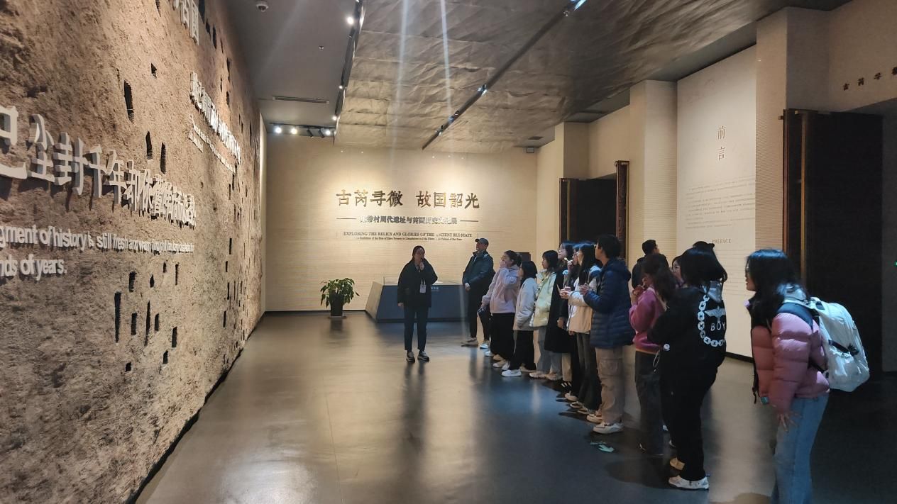 最后,同学们来到了梁带村芮国遗址博物馆。芮国遗址博物馆作为近年来考古研究的重要成果展示地,通过丰富的文物展品和先进的展示手段,揭示了芮国从西周早期到晚期的政治、经济、文化发展脉络。博物馆展出的青铜礼器种类繁多,包括鼎、簋、鬲、尊、盘等,这些青铜器在西周时期是贵族阶层进行祭祀、宴饮等礼仪活动的重要用具。学生们在这里近距离观察了古代青铜器、玉器等珍贵文物,并通过互动体验,加深了对古代社会结构和礼乐文明发展的认识。