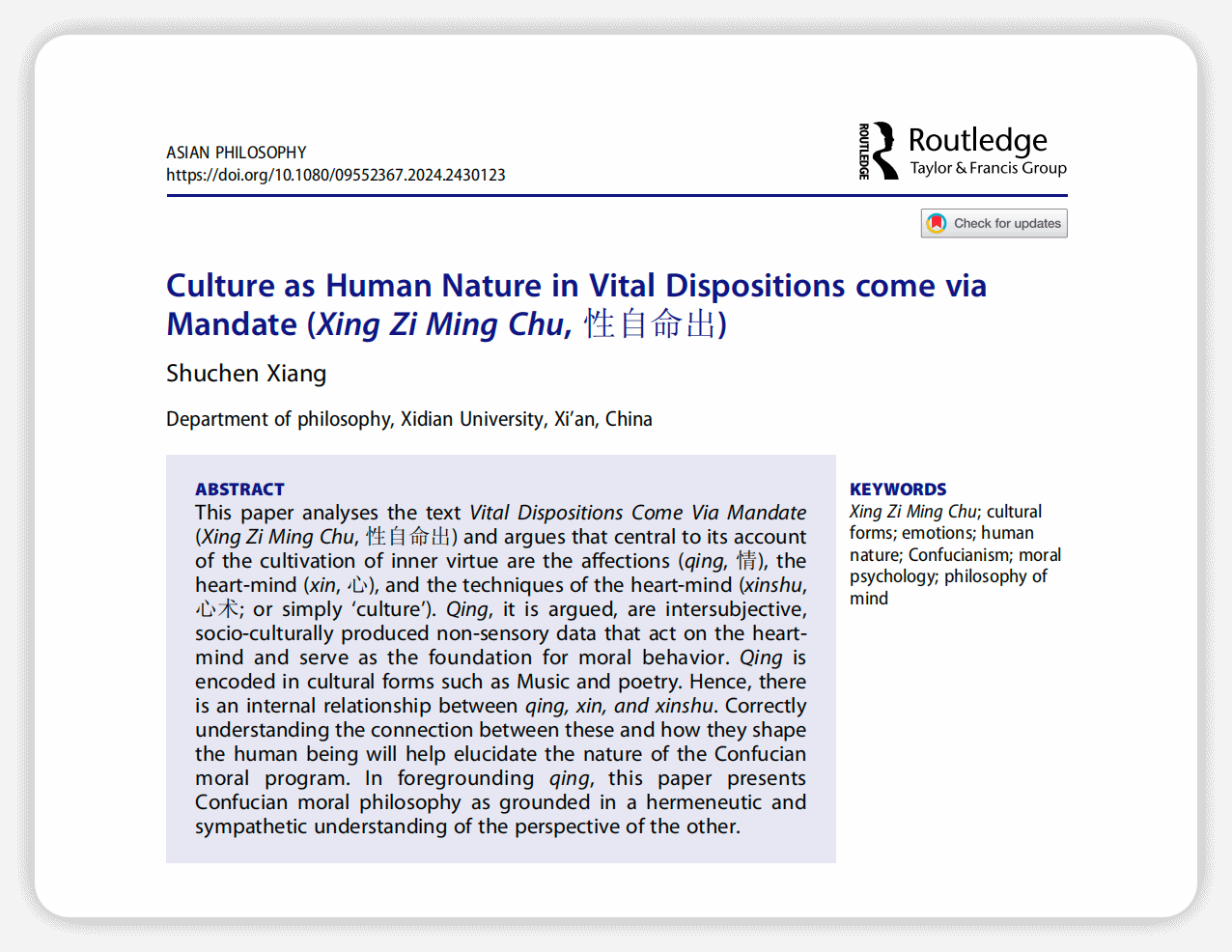 (通讯员 张万强)近日,东方哲学研究著名国际期刊Asian Philosophy上发表了beat365亚洲版官网项舒晨教授的论文“Culture as Human Nature in Vital Dispositions come via Mandate (Xing Zi Ming Chu, 性自命出)”(《“性自命出”中的人性论:文化即人性》)。
