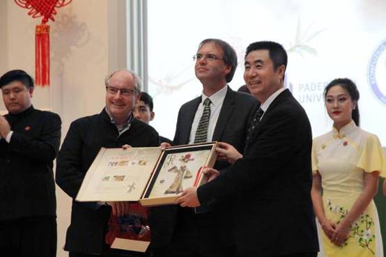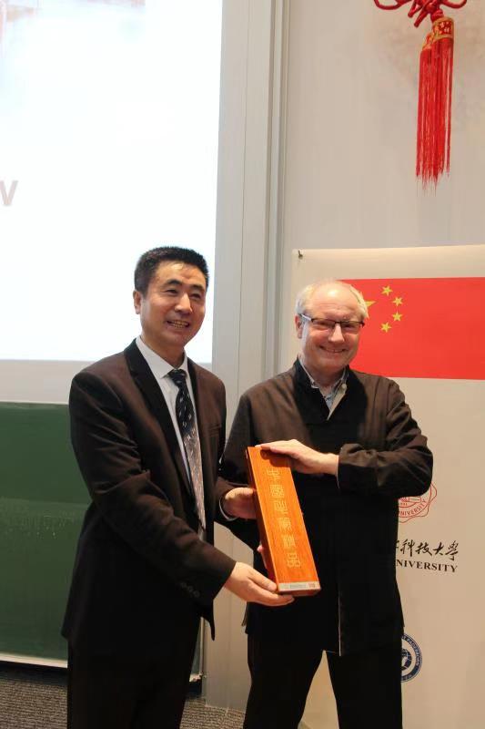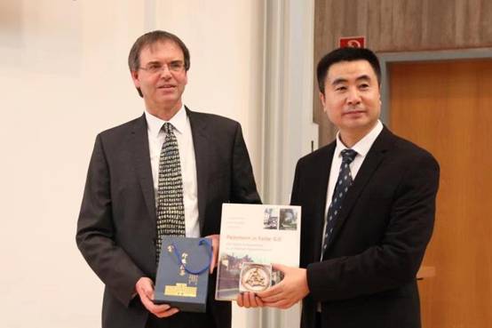 演出结束后,王成来老师代表出访团与帕德伯恩大学副校长托斯特•迈雅教授及孔子学院德方院长沃尔夫冈•卜汉姆斯教授互赠礼物,合影留念。帕德伯恩大学副校长托斯特•迈雅教授评价道:“这是学校最棒的一次中国文化演出!”他在离场后又特地返回,再次感谢beat365亚洲版官网赴德演出交流团为他们带来了充满惊喜与快乐的优秀文化交流活动。