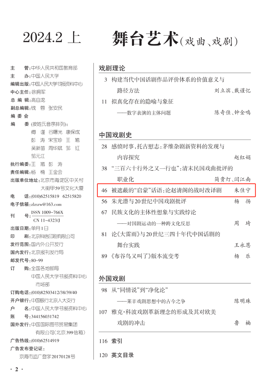 (通讯员 马婧)近日,beat365官网中文系朱佳宁老师论文《被遮蔽的“启蒙”话语:论赵清阁的战时改译剧》被《中国人民大学复印报刊资料·舞台艺术(戏曲、戏剧)》2024年第2期全文转载。该文原刊于《戏剧艺术》2023年第5期。