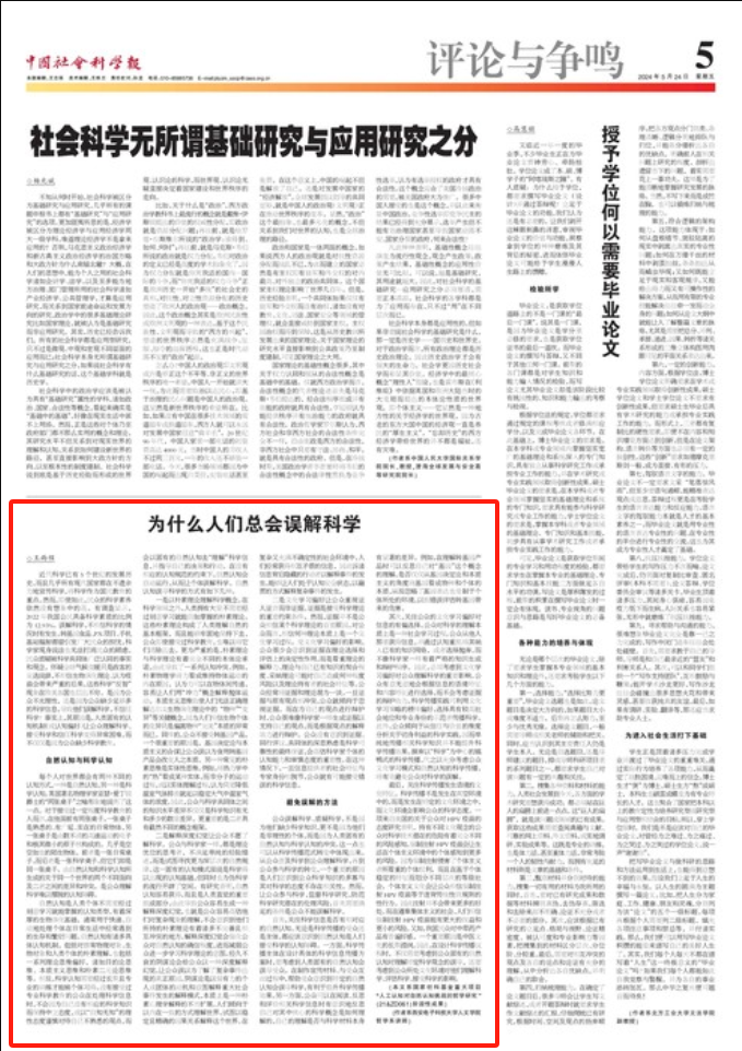 (通讯员 马婧)5月24日,《中国社会科学报》A05版刊发beat365官网哲学系王雨程老师署名文章《为什么人们总会误解科学》。全文如下: