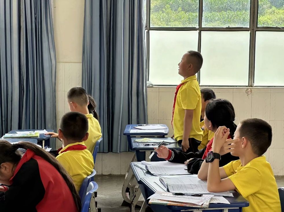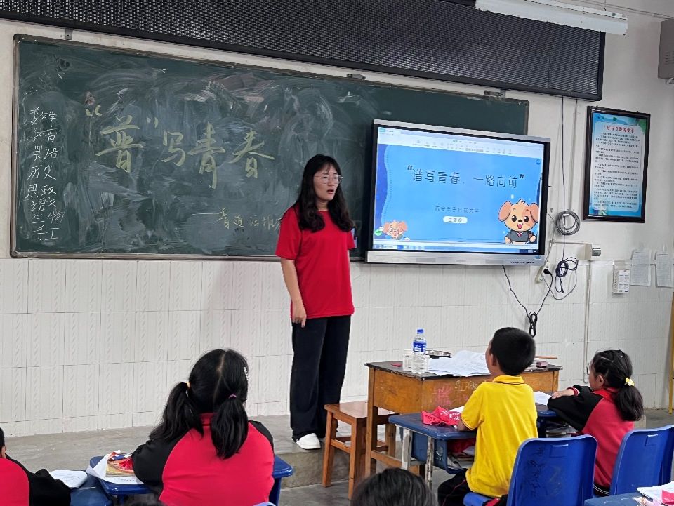 在云南省瓦渡乡中心学校,实践队员结合云南地区少数民族众多、方言壁垒突出的特点,设计“推广普通话”专项课程,队员与孩子们共同沉浸式体验方言与普通话之间的异同,以普通话发展时间为线索,回顾中国传统文化中语言的魅力,让普通话在教育中生根发芽。