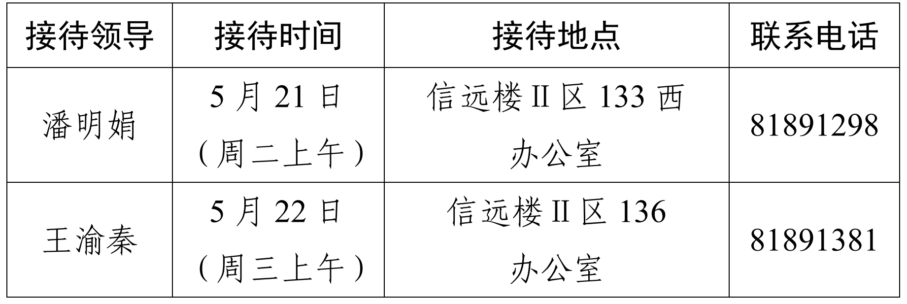 注:学院领导班子接待日主要受理的事项:1.学院人才培养、教学科研、学科建设、教师发展、对外交流、学生管理和服务保障等方面存在的问题与建议;2.反映有关学院重要决策和重要工作事宜的问题;3.涉及师生员工利益的申诉和诉求;4.亟须学院处理的难点问题;5.其他方面的建议和意见。