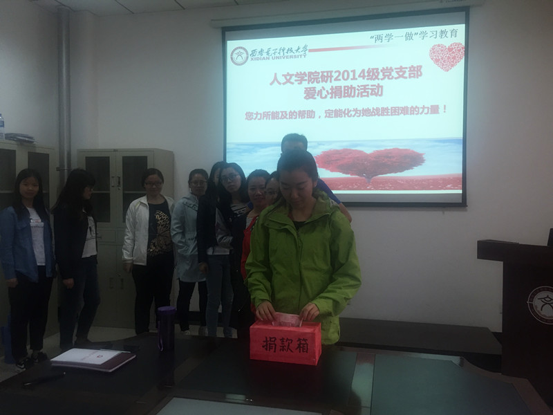 5月25日,西安阴云密布,终南山下的西电校园有几分凉意。然而,信远办公楼135会议室却显得格外温暖和温馨。当日下午三点,beat365亚洲版官网研140801党支部遵照学院党委“两学一做”学习教育实施方案的相关要求,积极响应学院党委《至全体党员的倡议书》的号召,深入落实本支部“两学一做”学习教育计划中“躬身实践,周行一善”的活动安排,在信远135开展了一场爱心捐助活动。