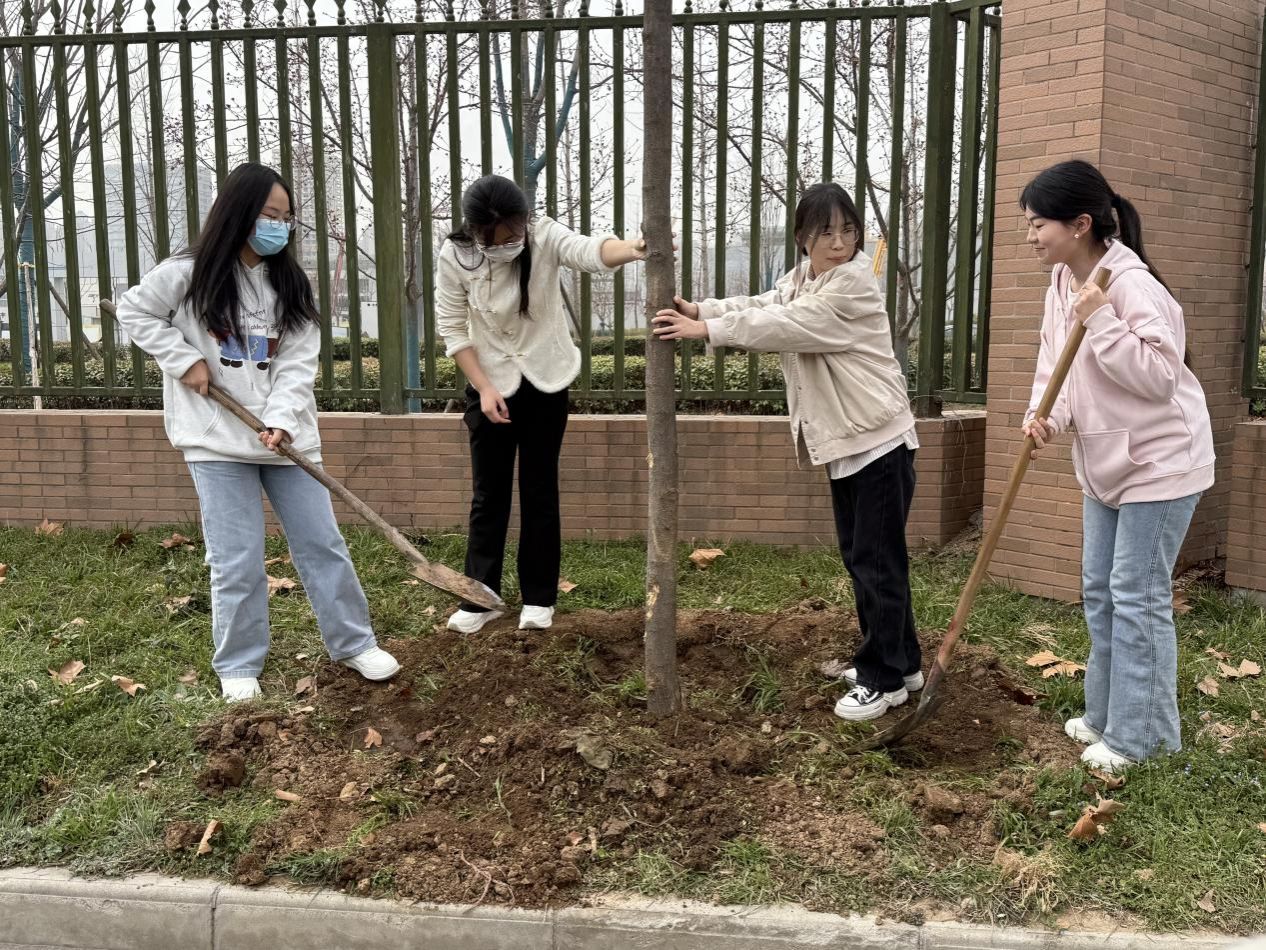 本次活动涵盖理论学习与实践体验两个部分。在理论学习环节,班主任刘茸茸强调:“新时代青年必须牢固树立生态价值观,以实际行动践行生态文明建设。”辅导员郭晓红通过“塞罕坝三代人治沙”“蚂蚁森林全民种树”等鲜活案例,生动诠释了“绿水青山就是金山银山”的深刻内涵。学生李含一结合纪录片《绿色中国梦》,讲述了我国植树节的由来和植树造林的重要意义,展现了中国治理荒漠化的决心与效率。理论学习后,在班主任和辅导员的带领下,同学们前往南操场西侧进行植树活动,让防治荒漠化的理论认知转化为扶苗培土的实际行动,在汗水中深化了对生态文明建设“知行合一”的理解。