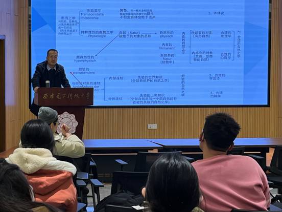 同时,马新宇老师以建筑术与哲学观的关系为切入点。建筑术属于康德的先验方法论部分,但意义又不局限于先验方法论,其目的是使知识统一起来成为科学,即用理性方法将单纯聚集的普通知识变成系统的典范知识,在系统之中这些知识才能支持和促进理性,而哲学就是这样的典范知识。随后,马老师讲解了康德对哲学的四重界定。即从概念而来的理性知识、一切哲学知识的系统、有关一切知识与人类理性的根本目的之关系的科学,以及人类理性的立法。最后,马新宇老师用清晰的图谱为大家介绍了康德对形而上学的界定与划分,形而上学区别于经验哲学和数学,是纯粹哲学的对象,又可细分为先验哲学和纯粹理性的自然之学两个部分。