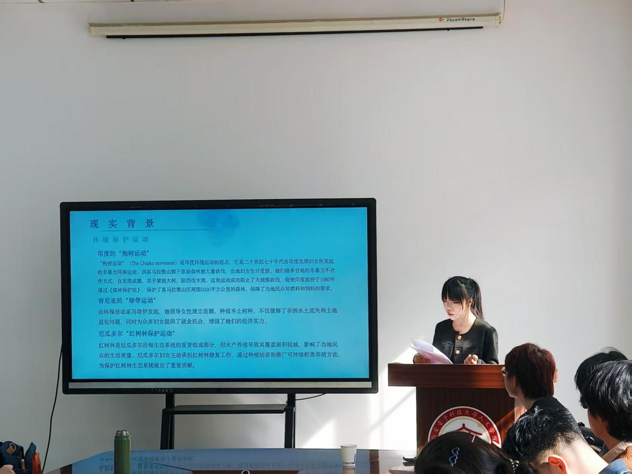 黎雅歆以《范达娜·席瓦的生态女性主义思想及其实践》为题进行汇报。她从西方生态女性主义理论的吸收、印度本土文化的深厚底蕴、甘地思想的影响以及现实背景等多个维度,深入剖析了席瓦思想的形成过程,并系统介绍了席瓦生态女性主义思想的缘起。她指出,席瓦继承了生态女性主义的基本观点,强调只有通过寻求女性与自然的共同解放,才能实现二者的真正解放。李昊天在评议环节认为文章内容应进一步深入探讨上述元素如何在席瓦的思想中的具体体现以及如何与生态保护实践相结合,更详细地分析甘地的具体理念如何在席瓦的思想中找到体现,以增强论文的理论深度。苏丽老师在评议环节询问了论文写作进度,指出虽然论文的第一章内容通常用于描述研究背景,但应避免内容过于冗长,防止论文内容头重脚轻,需要进一步提炼主题,使文章内容更加精炼,同时确保逻辑清晰、重点突出。