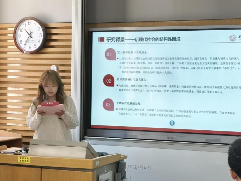 主讲人张严之以《“世界系”的存在危机表征与解法——以新海诚为例》为题,聚焦后现代社会语境下“世界系”动画的叙事模式,通过新海诚作品(如《秒速五厘米》的时空短信、《铃芽之旅》的闭门仪式)揭示个体在宏大叙事崩塌后面临的“符号化生存”困境,并批判其以情感乌托邦遮蔽现实矛盾的局限性。学院教师张万强与田昶奇在评议中强调,论文虽敏锐捕捉到“世界系”的批判性悖论,但需进一步收敛理论视角,聚焦个体的存在困境与焦虑,避免陷入后现代理论泛化的窠臼。