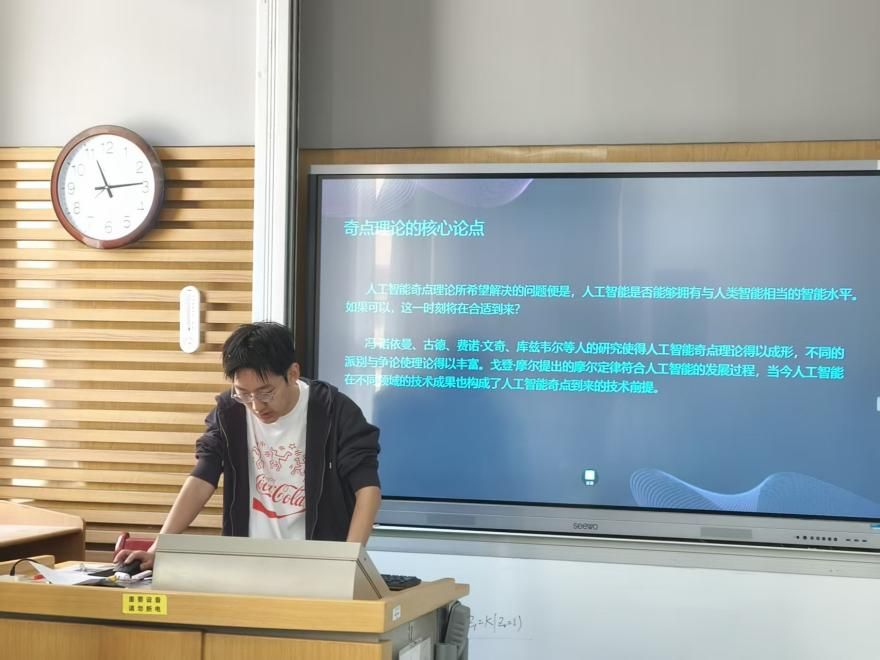 主讲人杨千禧龙围绕《人工智能奇点理论的三重面向解析》,从技术奇点的不可预测性切入,探讨人工智能发展可能引发的智能爆炸及其对人类文明的挑战,强调数学逻辑、伦理约束与人机关系重构的三重面向,提出在技术设计中注入伦理框架的必要性。学院教师张万强与田昶奇在评议中指出,研究虽具宏观视野,但需强化分析的实证锚点、聚焦于某一观点分析,实现从抽象思辨到具象批判的范式跃迁。