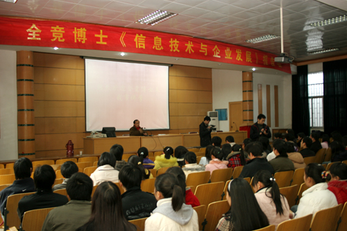 全博士在讲座中指出,“中国的IT并不比美国差多少,中国的百度、新浪、2688都是比较成功的”,全博士虽远在美国但始终关心着祖国的建设与发展。他深入浅出地向大家剖析了国际当前信息技术的发展情况。在谈到信息技术与企业发展的关系时,他强调信息技术对企业的生存不是很重要,但对企业的发展是至关重要的。现在国际上销量最好的轿车品牌不是通用和福特,而是日本的丰田,因为早在上个世纪70年代,日本就开始应用信息技术对以后的汽车市场进行分析,以节约能量为发展目标,才创造出现在的丰田汽车市场。典型的案例分析,让大家更加清楚和明白信息技术与企业发展关系。报告会上全博士还与听众进行了互动问答。