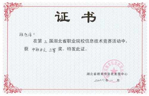 新闻网讯 近日,湖北省教育信息化发展中心表彰了湖北省第三届职业院校信息技术竞赛获奖单位及选手,伟德官网计算机工程系学生张旭海同学获高职中文类三等奖,经济贸易系学生徐金凤同学获高职英文类三等奖,计算机工程系学生邓浇华、黄芳、王芳、经济贸易系学生管海翠、林宽同学获高职中文类优秀奖,十堰职业技术学院获优秀组织奖。