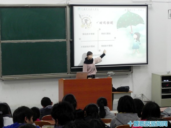 由院阳光心理协会手语社的十几名代表带动全场同学一起做“相亲相爱一家人”、“感恩的心”的手语舞蹈,并和全场同学进行互动,全场的气氛顿时活跃起来。在讲座过程中,徐老师用幽默亲切的话语为大家讲述了富有哲理的“两块小石头”的故事,告诉大家在学习过程中要珍惜时间,脚踏实地,勇于从现在开始改变。活动中,徐老师和同学们一起做了“手操”、“时间剪尺”、“学习归因倾向测试”等积极向上的游戏,这些游戏不仅活跃了现场气氛,还让同学们体会到了时间短暂、把握机会的重要性。徐瑛老师强调,同学们在大学期间要制定合理的学习规划,正确掌握学习方法,珍惜现在所拥有的时光,发挥好自己的特长,上课期间做到:听方法、听思路,在最短的时间内达到最高的效率,做一个大智慧的人。