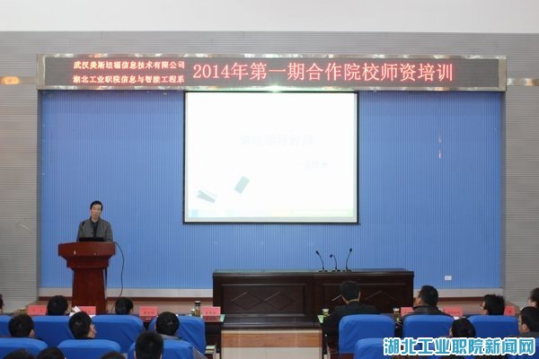 新闻网讯(通讯员 黄召阳)1月6日上午,信息与智能工程系与武汉美斯坦福信息技术有限公司联合举办的“2014年第1期合作院校师资认证培训”开班典礼,在院科技楼学术报告厅隆重举行。系主任夏德洲、党总支书记莫足琴,武汉美斯坦福公司副总经理张永龙、校企共建专业主任陈方亦,该系全体教师出席了本次活动。来自襄阳职院、长江职院、岳阳职院、荆州理工职院等八所高职院校共建专业的骨干教师共计50余人参加本次培训,开班典礼由信息与智能工程系校企共建专业老师肖海霞主持。