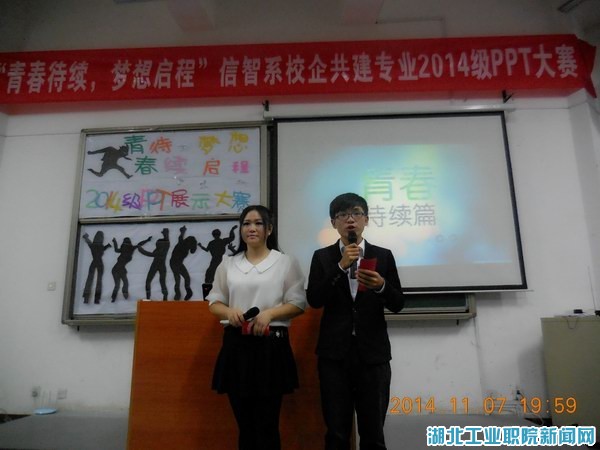 新闻网讯(通讯员 鲁薪霓 许朴)为推动学风建设,提高学生自主学习能力,展示学生青春风采,117日晚19:00,信息与智能工程系校企共建专业在4号教学楼4101教室举行“青春延续,梦想启程”PPT演讲大赛。该系党总支书记莫足琴,副主任欧阳艳阶、张明,校企共建专业主任陈方亦,副主任曹艳、肖海霞、郑健及2014级全体师生观看了本次比赛,比赛由2013级学生张中强和王慧主持。