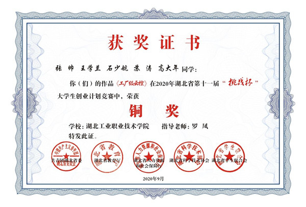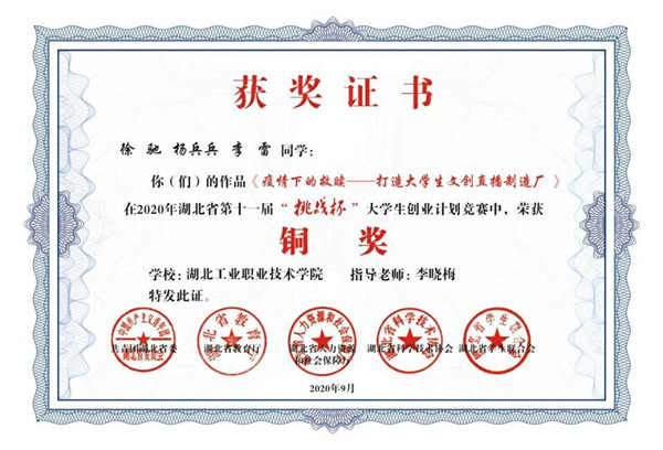 新闻网讯(通讯员李晓梅)近日,第十一届“挑战杯”湖北省大学生创业计划竞赛落下帷幕,伟德官网双创团队斩获两枚铜奖。伟德国际victor19462018级电气自动化技术专业张帅学生团队项目《工厂级云控》、伟德国际victor19462019级电气自动化技术专业徐驰学生团队项目《疫情下的救赎——打造大学生文创直播制造厂》获大赛铜奖。