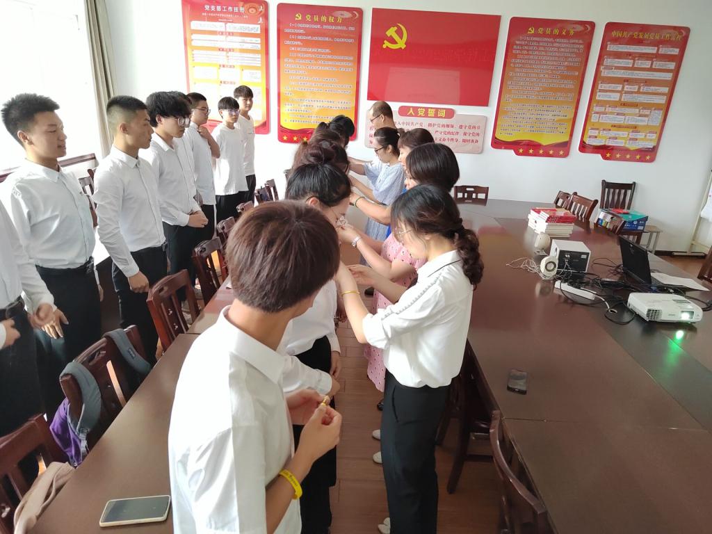 仪式在《国际歌》中拉开帷幕,教师党员代表为18名新党员佩戴党徽,在学生党支部书记徐丽的领誓下,18名预备党员向党旗庄严宣誓,其他党员老师重温入党誓词,铿锵有力的宣誓声,久久激荡在每位党员的心中,进而明晰入党初心,坚定爱党、忠党、跟党走的理想信念。新党员代表谢优同学发言表态,表示要发挥先锋模范作用,牢记党的宗旨,树立坚定信念,为党的事业奋斗终生。
