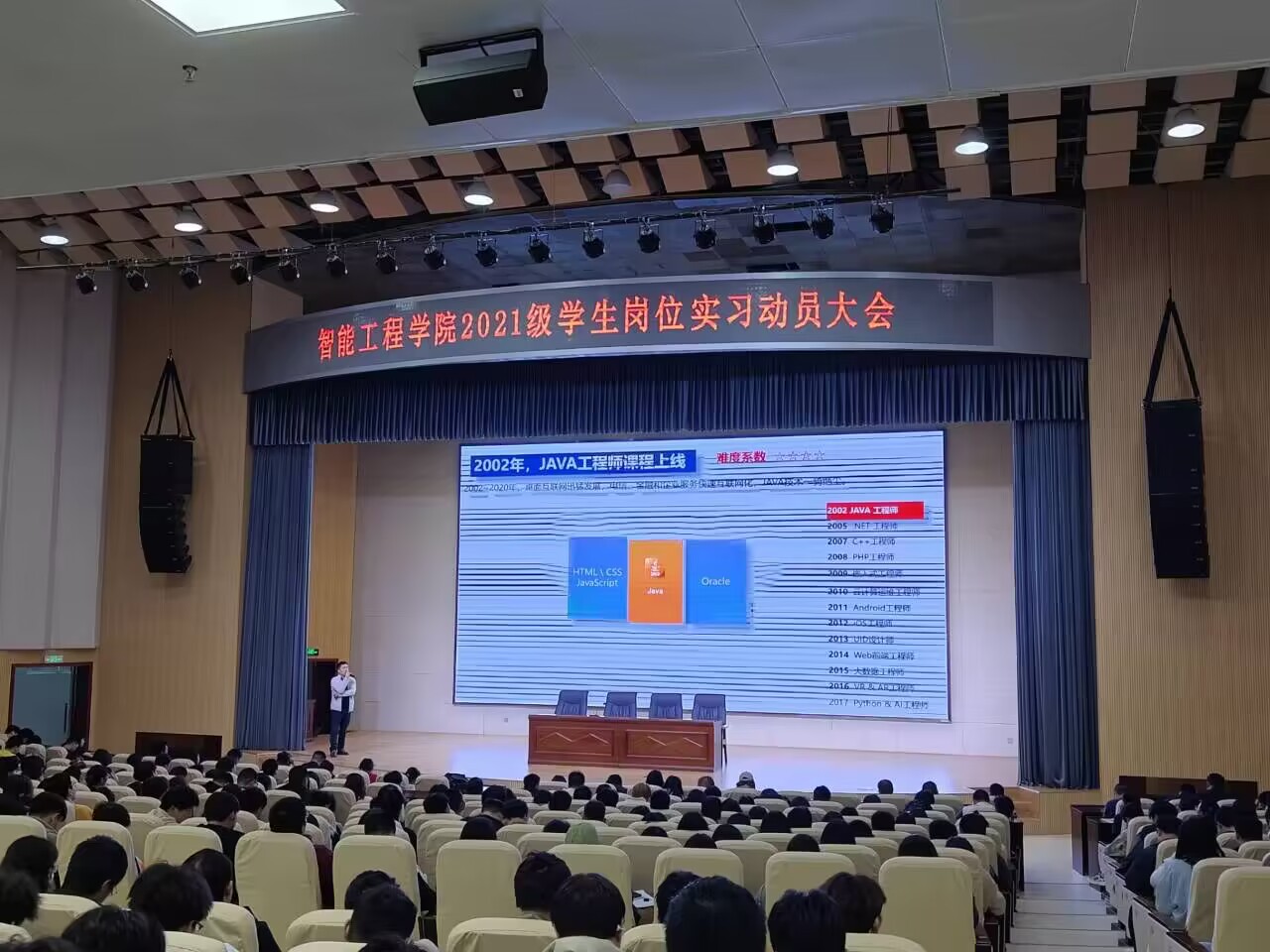 伟德国际victor1946党总支书记王蓉对此次实习做了动员讲话,明确了岗位实习的任务、目的和意义,强调岗位实习的注意事项,提醒学生注意自身安全、岗位安全、防诈骗、防网络犯罪、防溺水等,并要求全体实习学生充分利用好这次实习机会,在实践中学习成长,严格按照岗位实习要求,高标准、高质量地完成实习任务。副院长王家旭宣布了2021级学生岗位实习安排,从岗位实习任务、实习纪律、实习考核等方面进行了安排和要求。来自智能科技、电子等企业的招聘人员现场进行了宣讲,将岗位实习的具体要求、待遇和注意事项进行了详细的介绍和说明。